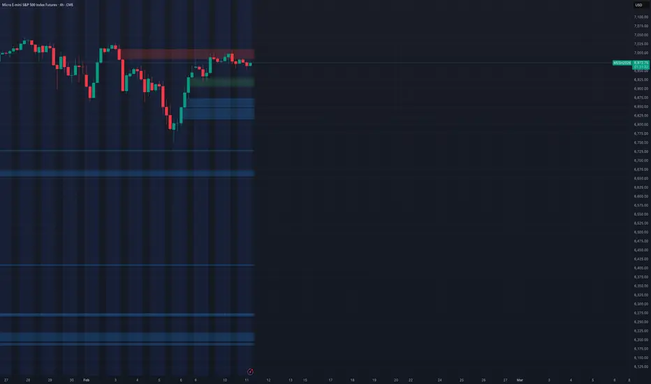 - Tapped (lighter shade) — Price has entered the zone but hasn't resolved it