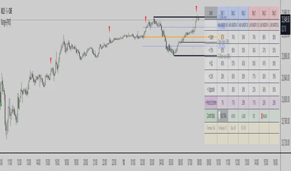 Range Stats with Sweeps + Time Analysis + Bias is a sophisticated Pine Script indicator designed for professional traders who demand precision in range-based market analysis. This comprehensive tool combines traditional range level analysis with advanced sweep detection algorithms, time-based probability modeling, and dynamic bias calculation to provide institutional-quality insights into market behavior patterns.