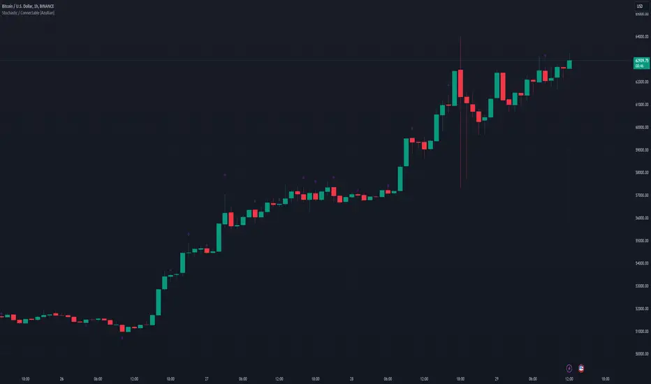 This connectable Stochastic indicator is part of an indicator system designed to help test, visualize and build strategy configurations without coding. Like all connectable indicators, it interacts through the TradingView input source, which serves as a signal connector to link indicators to each other. All connectable indicators send signal weight to the next node in the system until it reaches either a connectable signal monitor, signal filter and/or strategy.