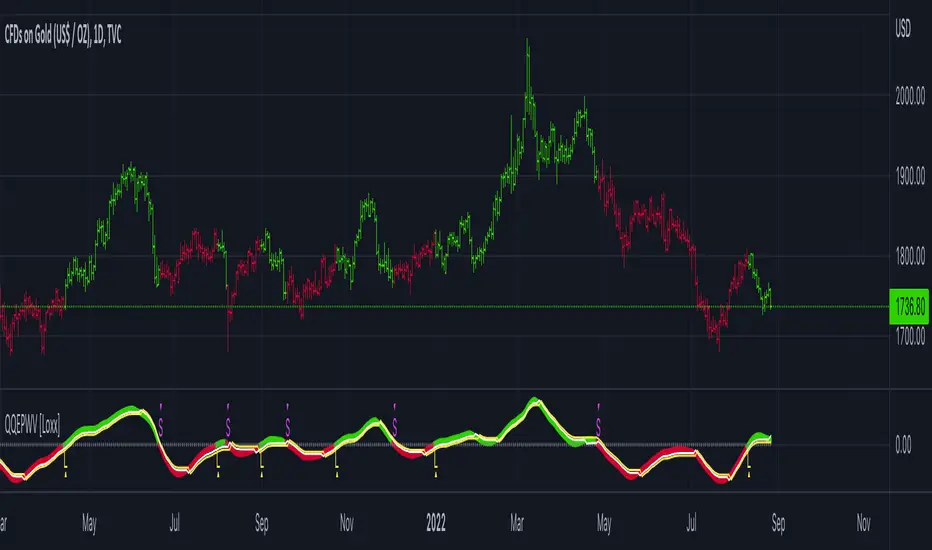 QQE of Parabolic-Weighted Velocity [Loxx] is a QQE indicator that takes as its input parabolic-weighted velocity calculation. This version can help in determining trend. Adjust the calculating period to your trading style: longer - to trend traders, shorter - for scalping.