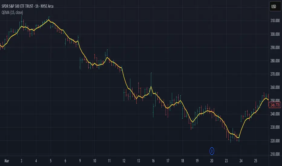 The Quadruple Exponential Moving Average (QEMA) is an advanced technical indicator that extends the concept of lag reduction beyond TEMA (Triple Exponential Moving Average) to a fourth order. By applying a sophisticated four-stage EMA cascade with optimized coefficient distribution, QEMA provides the ultimate evolution in EMA-based lag reduction techniques.