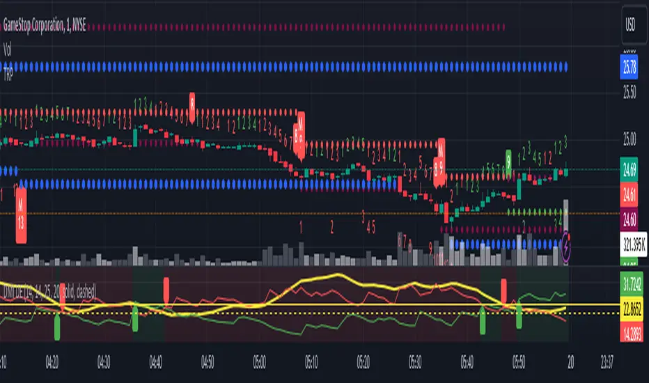 This script uses the existing built-in DMI indicator but adds two lines indicating strength of the ADX trend. The original author J. Welles Wilder, indicated a ADX trending strongly above 25 (yellow by default), and ADX trending weaker at a threshold of 20 or below (dashed yellow by default).
