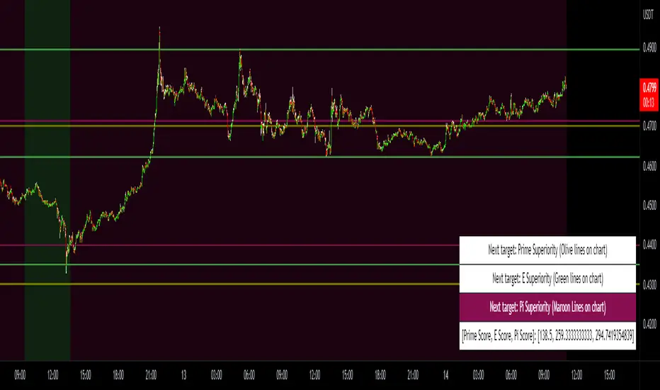 If you have been studying the markets long enough you will probably have noticed a certain pattern. Whichever trade entry/exit logic you try to use, it will go through phases of working really well and phases where it doesn't work at all. This is the markets way of ensuring anyone who sticks to an oversimplified, one-dimensional strategy will not profit. Superiority cycles are a method I devised by which code interrogates the nature of where price has been pivoting in relation to three key structures, the Prime Frame, E Frame and Pi Frame which are plotted as horizontal lines at these values: