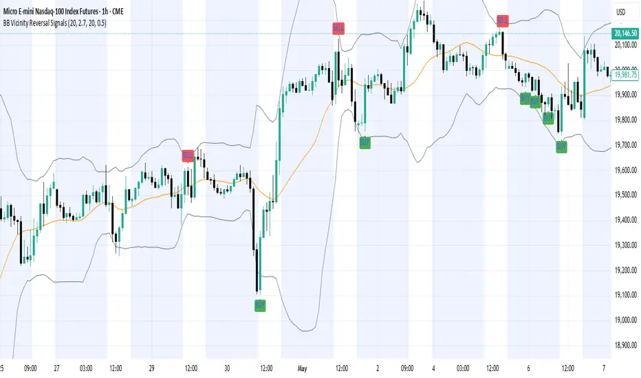 This indicator detects potential intraday reversal opportunities based on price action near the outer edges of Bollinger Bands (±2.7 std dev). Unlike traditional Bollinger Band signals that require strict band touches or crossings, this tool identifies reversals that occur in the vicinity of the outer bands, increasing signal frequency while maintaining logical precision.