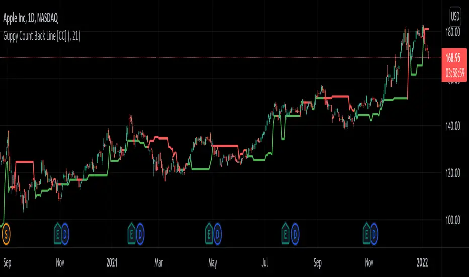 The Guppy Count Back Line was created by Daryl Guppy and is essentially a trailing stop indicator. I have color coded the indicator to tell you if you should go long or short.