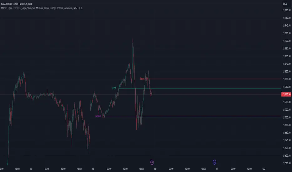 Displays price level at specified market open times. For instance, if a user specifies a market opens at 08:00, then a price level (horizontal line) will be drawn at the most recent 08:00 candle's open price (if GMT Offset is set to 0).