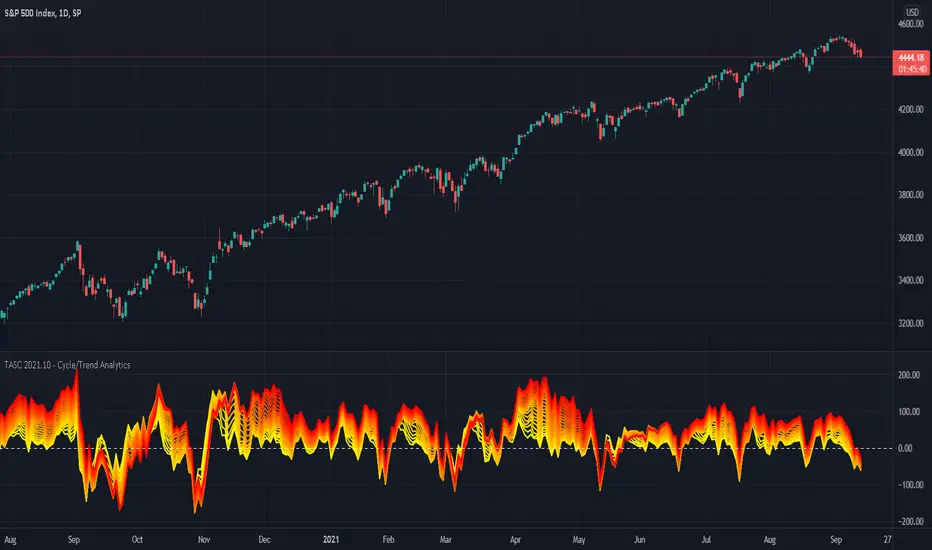 Presented here is code for the "Cycle/Trend Analytics" indicator originally conceived by John Ehlers. This is another one of TradingView's first code releases published in the October 2021 issue of Trader's Tips by Technical Analysis of Stocks & Commodities (TASC) magazine.