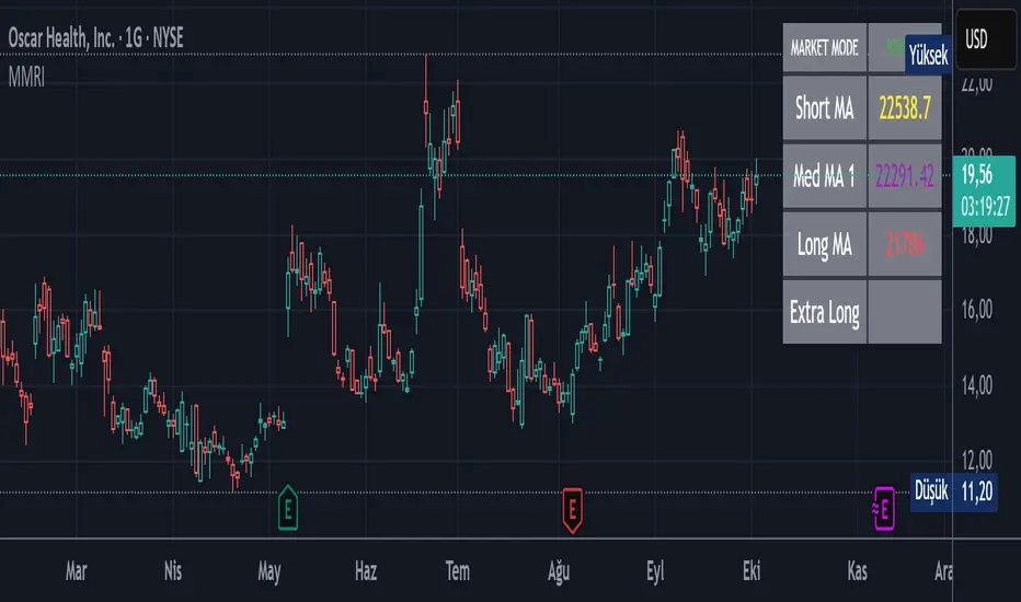 This custom indicator helps traders gauge market risk sentiment by monitoring Exponential Moving Average (EMA) or Simple Moving Average (SMA) crossovers on key indices like BIST 100 (for Turkish markets), NASDAQ Composite (tech-focused US), or Dow Jones Industrial Average (industrial US). It dynamically categorizes the market into three actionable modes based on the index's position relative to layered MAs, providing a quick visual snapshot without cluttering your chart.