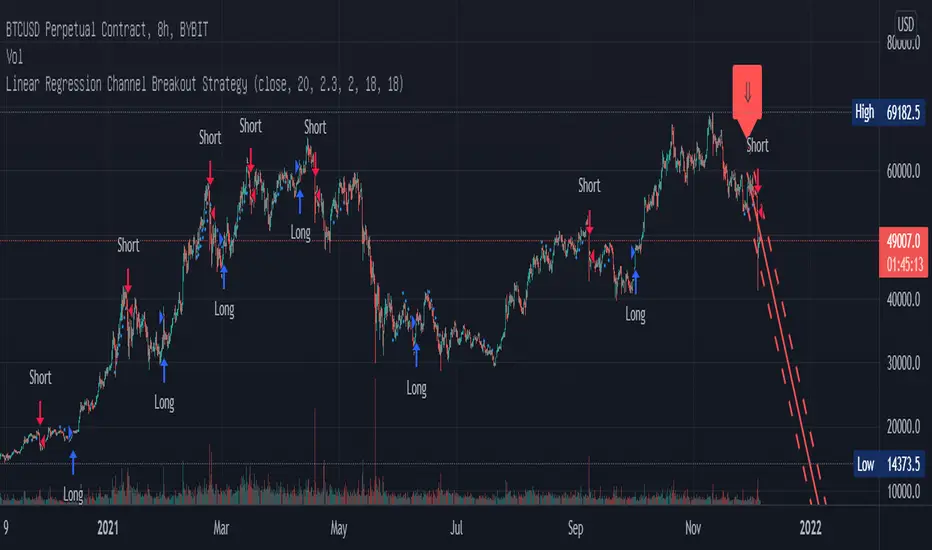 This strategy is based on LonesomeTheBlue's Linear Regression Channel Indicator. First of all, I would like to thank LonesomeTheBlue. Breaking the Linear Regression Channel to close the candle triggers a Long or Short signal. If the slope of the Linear Regression Channel is positive, it is Short when it breaks out the lower line, and when the slope is negative, it is Long when it breaks out the upper line. The default is optimized for 8-hour candles, and for other hour candles, find the optimal value yourself. Below is a description of LonesomeTheBlue's Linear Regression Channel.