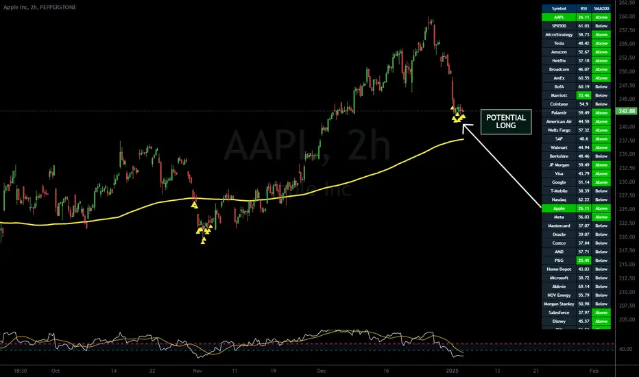 Looking at the chart of Apple (AAPL), the yellow triangles show where RSI dropped below 38 while price remained above the rising 200 SMA, providing multiple long entry opportunities in an established uptrend. Actually Apple may be better with RSI below 26.