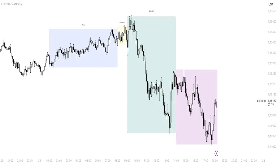The indicator is designed to display trading sessions on a TradingView chart. It highlights the time ranges of major sessions such as Frankfurt, London, New York, and Asia, providing the ability to analyze price behavior during different periods of the trading day.