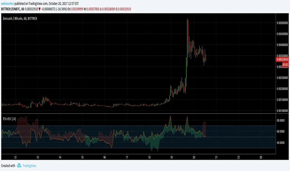 This script simply plots the current instruments RSI as well as Bitcoin's RSI from bitfinex. Helpful to identify when an alt is performing stronger than BTC or if BTC is dragging the alt down.