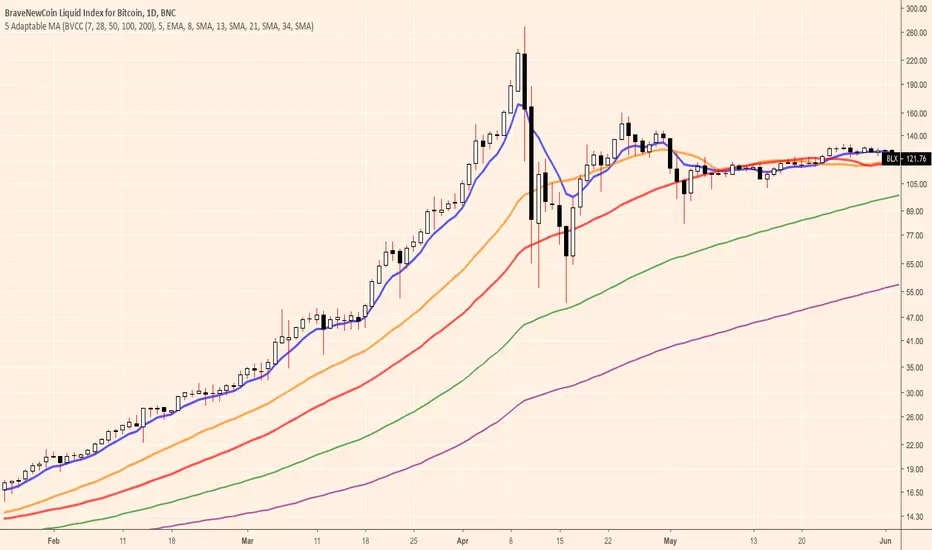 A slight evolution to the ideas presented in the original 7-28-50 BVCC overlay. This version allows you to switch between a custom 5 MA set up of your own choosing and the BVCC recommended 7-28-50-100-200 combo. Additionally, you can choose to mix the SMA and EMA components of the combo in any way that you wish.