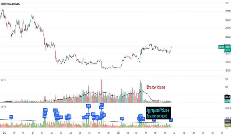 This script sums up volume of all major centralized exchanges (according to coinmarketcap) on the symbol you are visiting and has an option to exclude Binance's volume which can give you a more stable understanding for judgement when needed (and you can see the difference on the chart).