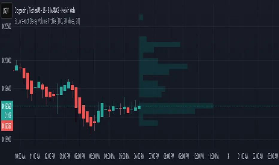 This indicator displays a custom price profile that mimics a volume profile using occurrence-based weighting rather than actual volume. It counts how often the selected price source (e.g., close) falls within each price bin over a lookback period. What makes it unique is the use of square-root time decay: more recent price occurrences are given greater importance, while older data is discounted proportionally to the inverse square root of its age.