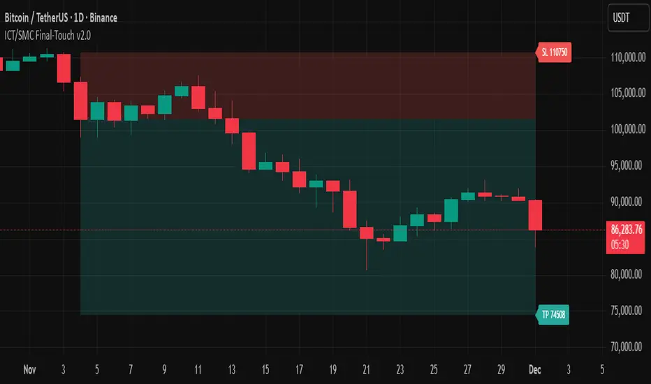 ICT/SMC Final-Touch is not just a charting indicator—it is a strategic companion that works intensively behind the scenes so that traders can see a complete, clean, and actionable trade setup at a glance. Its professional visualization and structured approach are designed to enhance trading clarity, discipline, and decision-making, offering a level of insight typically reserved for institutional traders.
