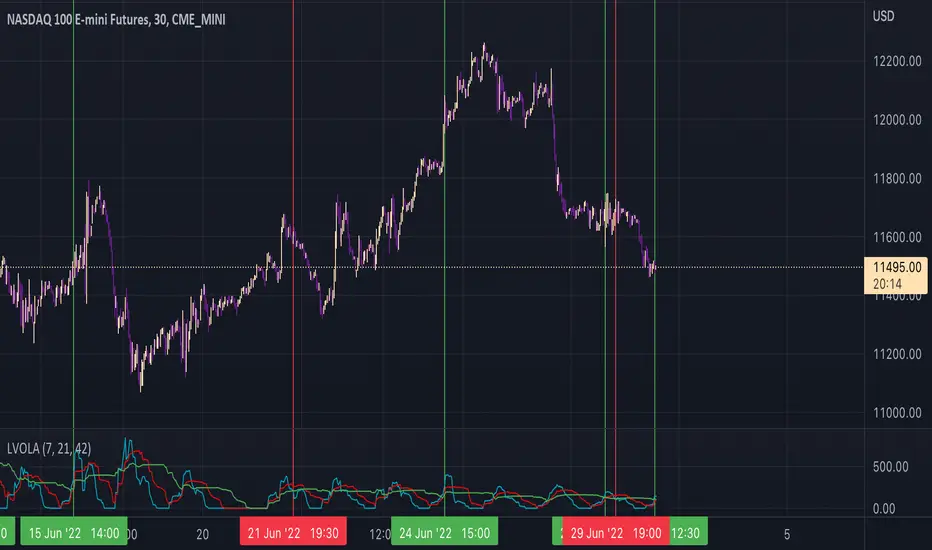 To use this script which focusses on vol on the given equity/commodity/price pair its focussed on at its core methodology. We use NQ1 here as an example on how this indicator can be used. Note the red lines indicate where buy signals occurred an example listed below. Note the best timeframes to use this indicator include (intraday - 1d trades) 7min, 30min, 1hr and Daily for multi day trades. This can be used in conjunction with MVEX VOLA, VOLA & ZVOLA (especially so) when looking to trade $NQ/