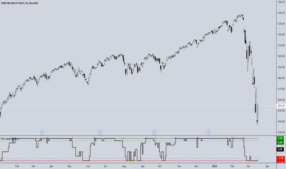 The TAI is an experimental indicator we created to begin working on a automated trading algorithm. It takes five signals from our indicators and gives a +1 or -1 for each signal depending on if the signal is bullish or bearish.