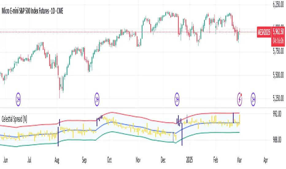 Celestial bands are just like Bollinger bands, but they consist of 3 bands based on percentage changes rather than standard deviation.