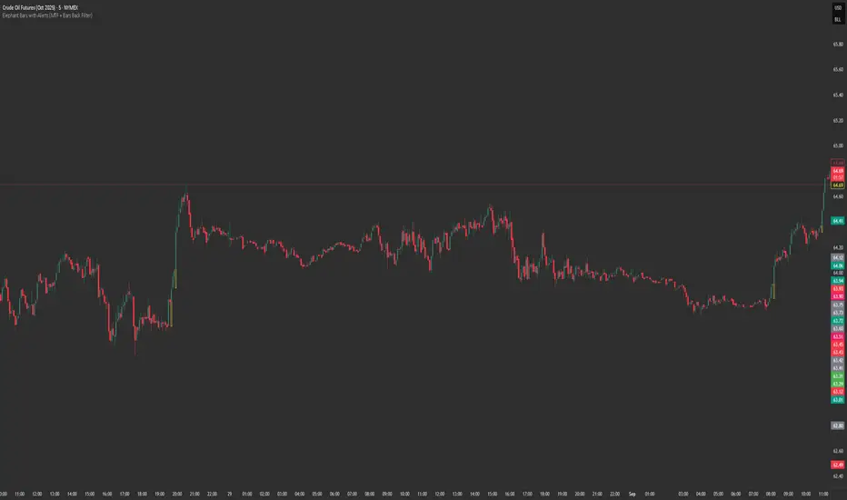 This indicator is designed to spot Elephant Bars – exceptionally large and decisive candlesticks that often mark the start of strong directional moves. Unlike standard “big candle” scripts, this tool goes further with advanced filters to highlight only the most meaningful momentum events.