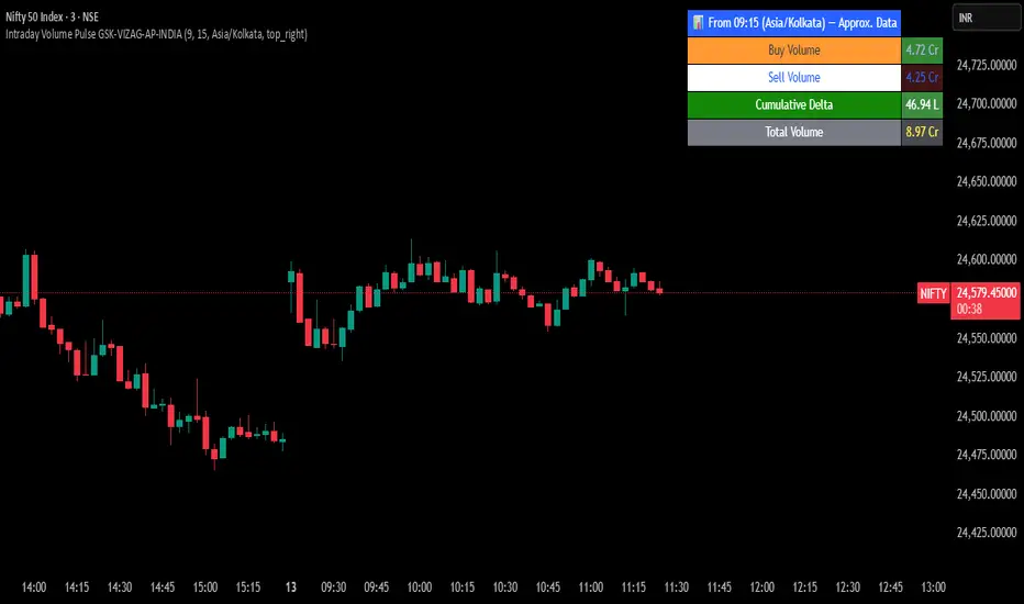 This indicator is designed to track and visualize intraday volume dynamics during a user-defined trading session. It calculates and displays key volume metrics such as buy volume, sell volume, cumulative delta (difference between buy and sell volumes), and total volume. The data is presented in a customizable table overlay on the chart, making it easy to monitor volume pulses throughout the session. This can help traders identify buying or selling pressure in real-time, particularly useful for intraday strategies.