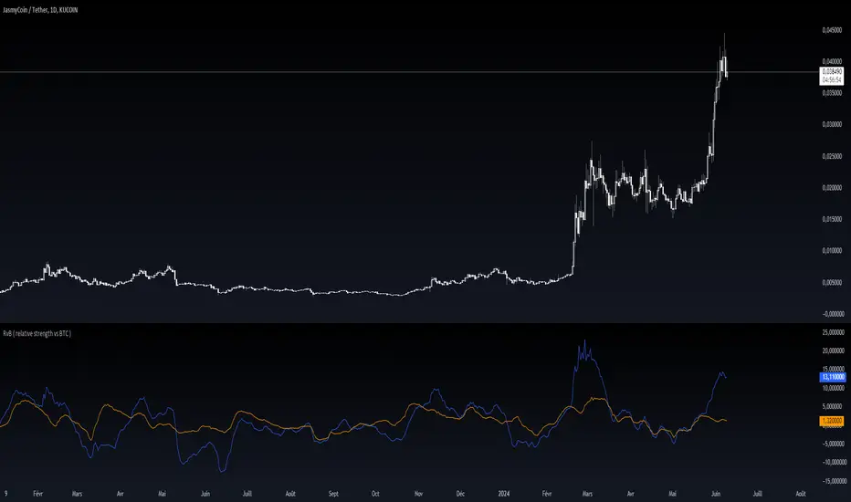 The "Coin vs BTC" indicator is designed to compare the performance of a selected cryptocurrency against Bitcoin (BTC) using Exponential Moving Averages (EMAs). By plotting the difference in EMA values as a percentage, this indicator helps traders visualize the relative strength of a cryptocurrency compared to Bitcoin over specified periods.