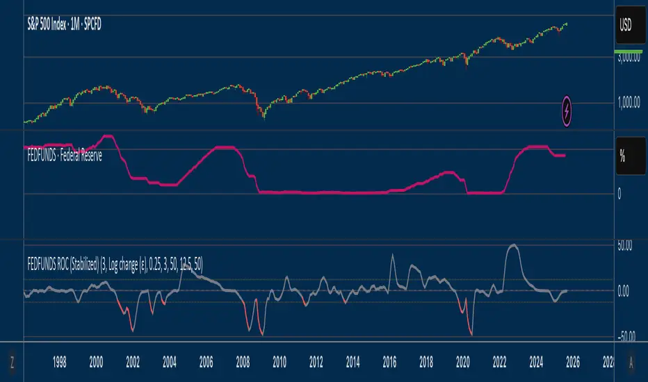 This indicator pulls the Effective Federal Funds Rate (FRED:FEDFUNDS, monthly) and measures how quickly it’s changing over a user-defined lookback. It offers stabilized change metrics that avoid the “near-zero blow-up” you see with naive % ROC. The plot turns red only when the signal is below the lower threshold and heading down (i.e., value < –threshold and slope < 0).