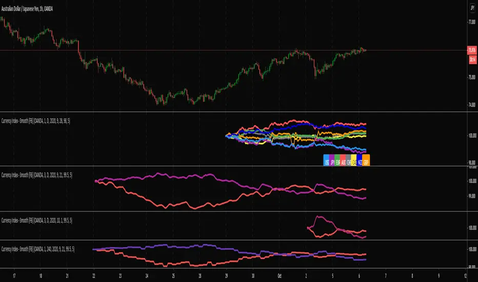 You can view all the indexes together for a broad view of all the currencies, where you can see the power of the inter-market flows and also which currencies are riding/correlating together...