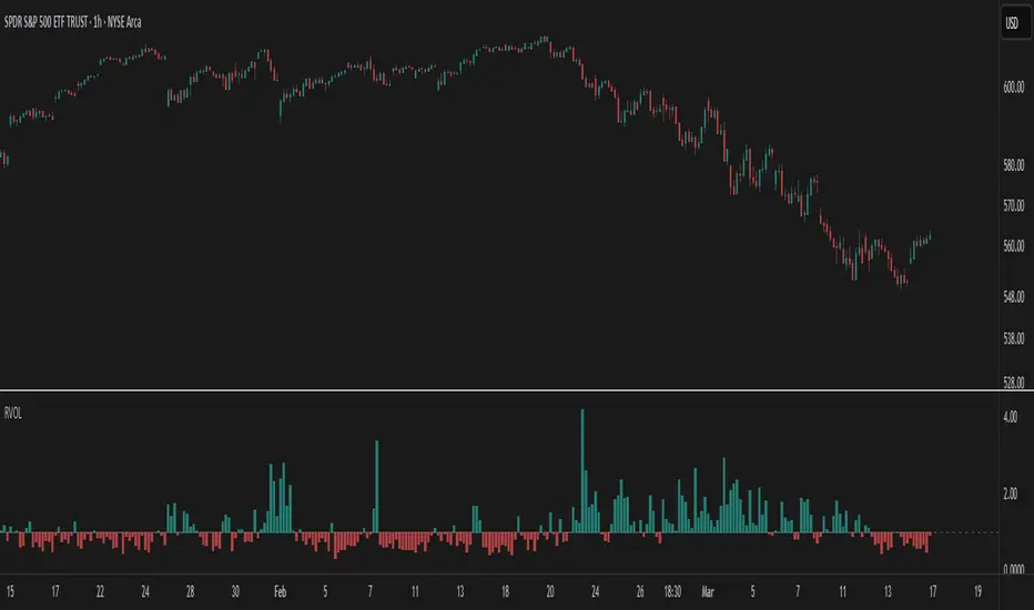 The Relative Volume at Time indicator (RVOL) is a simple modification of the original Relative Volume at Time script available in TradingView’s public library. It doesn’t change how the indicator works but includes two small adjustments: