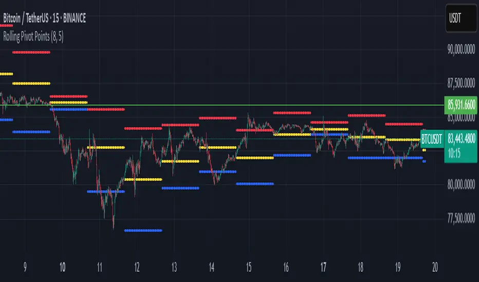 The "Rolling Pivot Points" indicator, built in Pine Script (version 6) for TradingView, overlays dynamic pivot levels on a price chart. It calculates a 24-hour lookback period (length = 1440 / (timeframe.in_seconds() / 60)) using the prior period’s high, low, and close to determine a Pivot Point (vPP) and three resistance (vR1, vR2, vR3) and support (vS1, vS2, vS3) levels. Plotted lines include vPP (yellow), vR1 (red), and vS1 (blue) in a cross style, with a customizable reset time (default: 8 AM) to refresh levels daily.