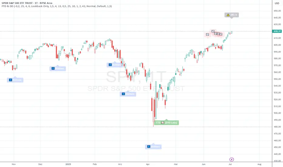 This update significantly improves the accuracy of Follow-Through Day detection and bottom identification, also during extreme market conditions. The indicator now properly tracks major market bottoms like the March 2020 Corona crash.