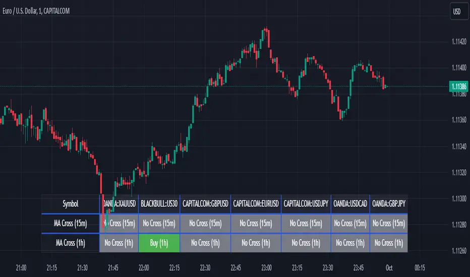 This script, "Screener MA Cross," is designed to monitor and display MA (Moving Average) cross signals across multiple timeframes and symbols. With the latest update, it offers more flexibility, style, and usability. Here are the key features: