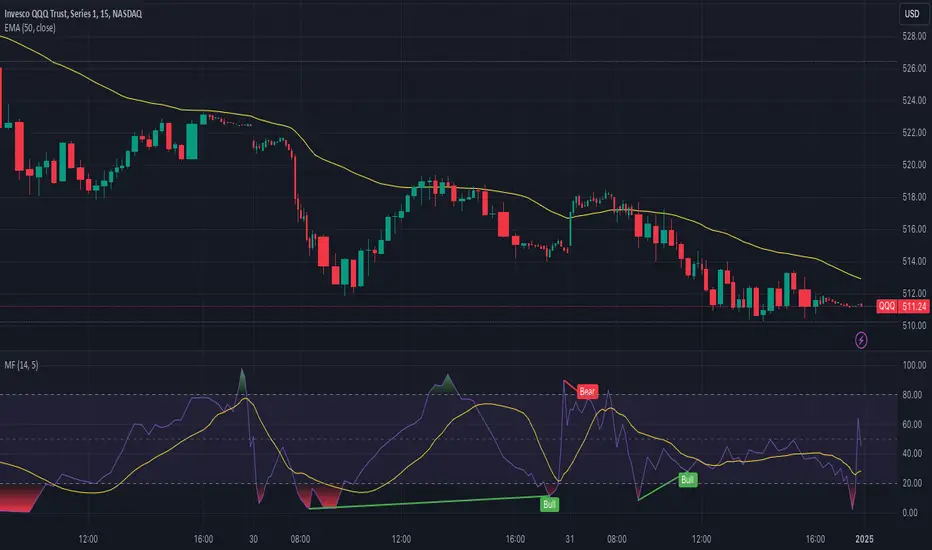 Bullish MFI Divergence – When price makes a new low but MF makes a higher low.