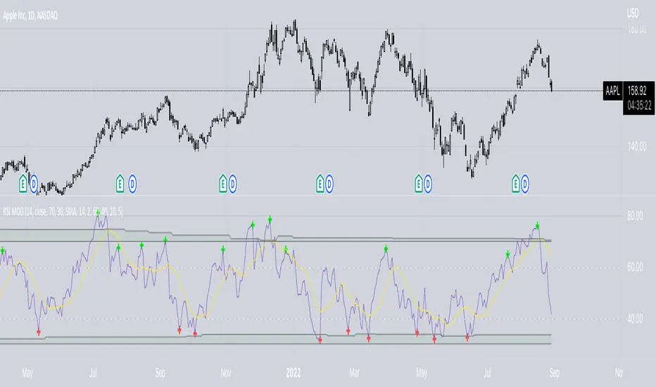 The RSI is an excellent indicator for determining when equities are overbought/oversold. Though I believe there is a shortcoming in using the 70/30 levels since they are static and do not adjust for when an equity is trending. It stands to reason that in a downtrend, the overbought might be less than 70 and the oversold less than 30—Vice versa for a bull trend. Using the built-in function of pivots, I have attempted to create overbought/oversold lines that adjust with the trend. Leaving the 70/30 lines on the indicator also helps visualize the equity trend. All pivot settings are adjustable in the input menu. The pivot limits serve as a filter for recording pivot points. For example, with an upper pivot limit of 60, only pivots greater than 60 will be recorded into the array used to determine overbought. The crosses represent which values are used to determine overbought/oversold and do not provide timely indications.