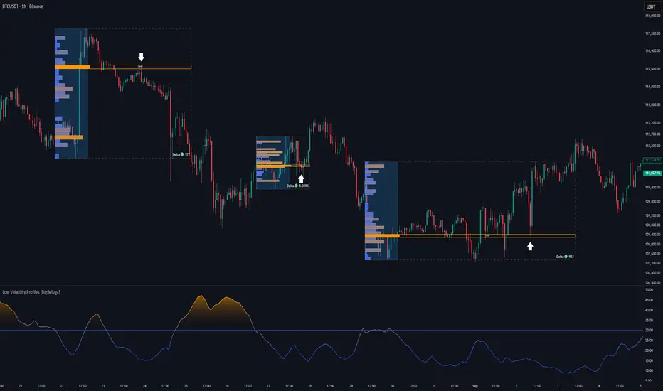 Low Volatility Profiles [BigBeluga] isolates accumulation phases and maps volume concentration before volatility expansion.