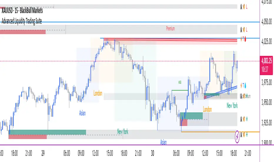 The indicator uses standard technical analysis methods (pivot detection, swing analysis, session time filtering) combined into a unified visualization tool.