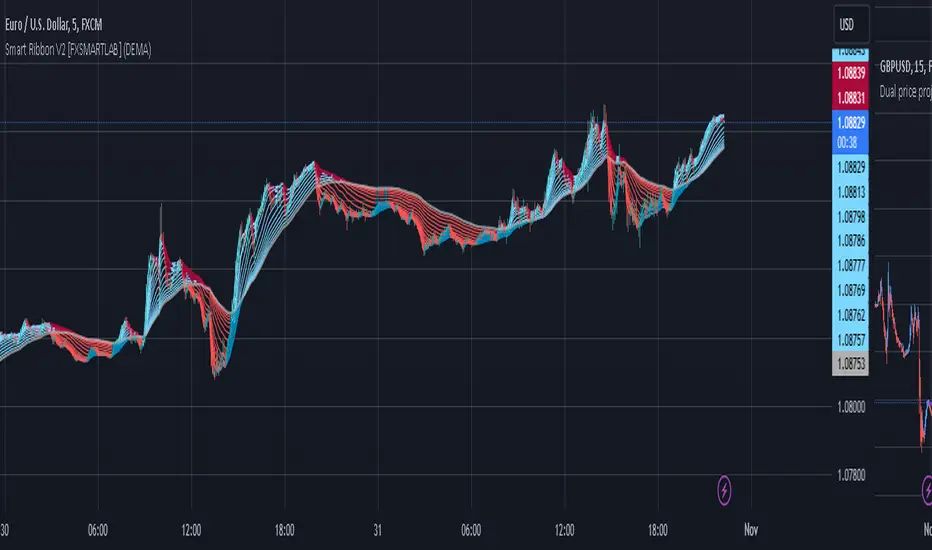 The Smart Ribbon V2 indicator is designed to analyze market trends and momentum by plotting a series of moving averages with varying periods, all within a single overlay on the price chart. This approach creates a "ribbon" effect, enabling traders to visualize trend strength, reversals, and potential entry or exit points. The indicator provides flexibility through different moving average types, including some advanced ones like QUEMA (Quadruple Exponential Moving Average) and QuintEMA (Quintuple Exponential Moving Average). Each moving average is color-coded to indicate trend direction and momentum, making it visually intuitive and effective for quick decision-making in trend-following strategies.