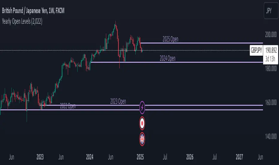 The Yearly Open Levels indicator is designed to help traders visualize the opening price of each year on a price chart.
