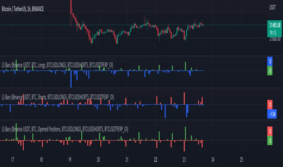 This indicator uses data provided by different crypto derivative exchanges to estimate and display the potential Longs and Shorts opened and closed during a determined period. The indicator supports multiple exchanges and coins.