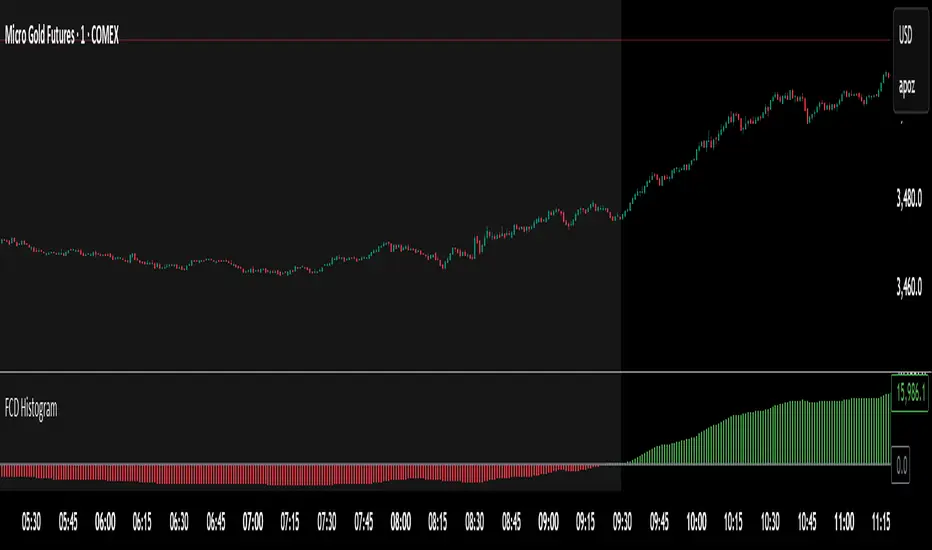 The Futures Confluence Delta (FCD) Histogram is a powerful trend-following indicator tailored for scalping futures on 1-minute charts. Displayed in a bottom panel like RSI or volume, it visualizes cumulative volume delta to identify bullish or bearish market momentum. The histogram turns green for positive delta (buying pressure, suggesting a long trend) and red for negative delta (selling pressure, indicating a short trend), providing quick insight into market direction.