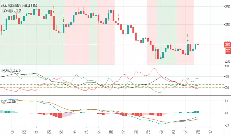 ADX Shader overlay. Places a background overlay for ADX weak trend (>20 and <25) and places a background overlay for a string trend (>25). Will also show Positive DM and Negative DM crosses.