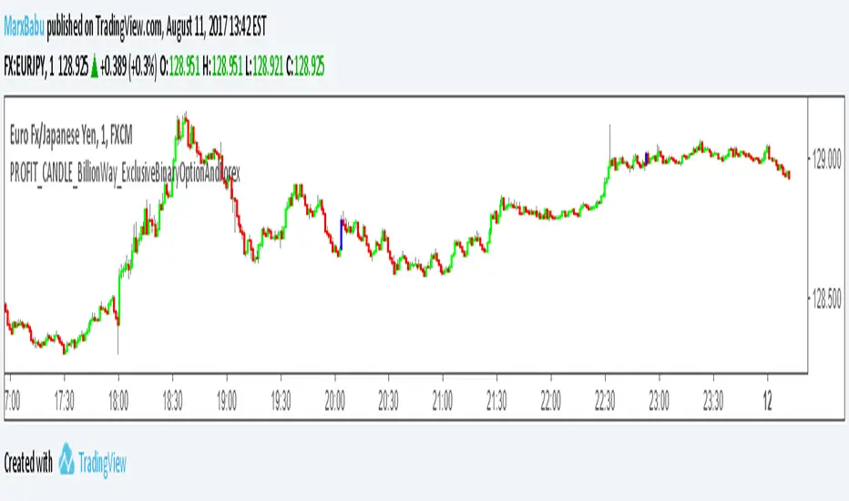 Here is the spectacular working Binary option script with Alert condition enabled code. Tested this with 1min and 5min and proven to be 80% ITM 8 win to loss out of 10 trades.One can use this for Binary option trading for some good win rates. This is the upgraded version of https://www.tradingview.com/script/Bnyq8FDm-PROFIT-CANDLE-BILLION-WAY-Indicator-Simplified/ Read through this before using this updated version. How it works and How to use this : 1.This can be applied for any time frame ,Best works in 30min ,1hr,1D,W,M -- For BinaryOption 1minchart ,5minchart with 1-2min expiry,5-10min expiry works best. 2.Only Look for the Blue handle to appear in the chart once you see the candle as soon as Enter "CALL in Binary option" ,Now you can enable the Tradingview Alert after the setting so that you get alert and trade (Put option logic not included ,This is only work for Call ,But it can be used for any forex,equity ,currency market) 3.As soon as you sea the blue candle forming Enter Buy (If you see the black candle after the candle made huge high avoid entering the trade at very high level price) and expiry time should be 1-2min for 1min chart, 5 to 10min for 5min chart ,Normally 1plus times of chart frame time. 4.If it is forex or equity Cover the the trade after 2to3 candle for quick profit or keep it for 15