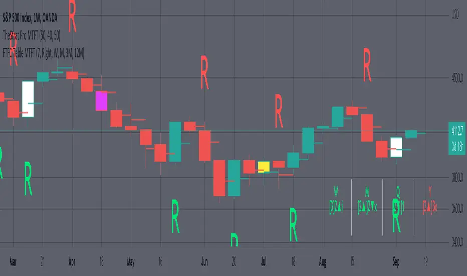 Rob Smith is the creator of ‘TheStrat’ trading strategy. For ‘TheStrat’ I have put together a suite of 5 premium scripts that combined will offer people interested in learning ‘TheStrat’ a cleaner learning process. For 2 of the 5 scripts specifically, the MTFT approach of overlaying multiple longer timeframes(TF) over a shorter TF selected as a display cannot be utilized. The other 2 scripts will have full MTFT functionality and they are my personal favorite. I will be providing very basic info to utilize this script; it is up to you to dive deep into learning this strategy. I am not an expert with the tool or a financial advisor. As with all aspects of life, I recommend you research, learn, discern and practice extensively in order to become a master.