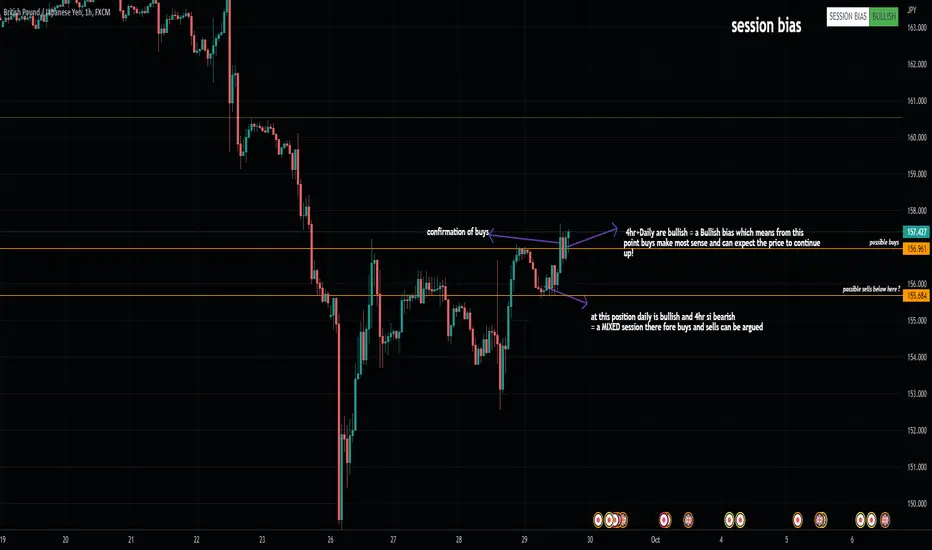 This script is designed for traders who want help defining their session bias it is for people who trade in sessions which will most likely be 1 4h candle. The way I trade using Price action to get my daily bias, to either look for sells or buys or both I look at the previous daily candle close and previous 4hr candle close before analyzing the structure on the lower time frames to get my session bias of bullish / bearish . so this indicator compares the daily and 4hr candles to develop a bias for exampleprevious daily bullish + Previous 4hr Bullish = BULLISH BIAS