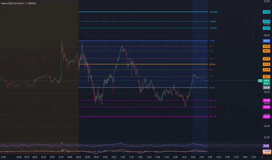 Bullish Bias: If the Low occurs first and the High occurs later in the Pre-Market, the script anchors the 0% at the Low and the 100% at the High. Extension targets (1.618, 2.618, etc.) are projected upward.