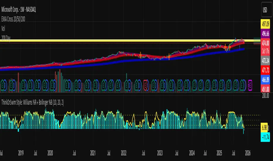 This custom indicator combines Williams %R and Bollinger %B into a single, unified panel to provide a powerful momentum-and-positioning view of price action. Modeled after the ThinkOrSwim version used by professional traders, it displays: