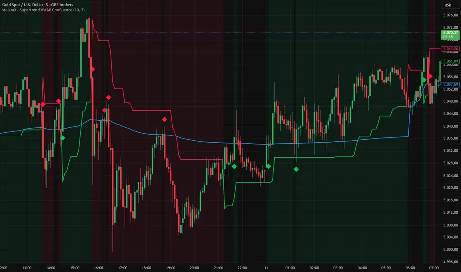 stelaraX – Supertrend VWAP Confluence is a trend and fair-value confirmation indicator designed to highlight higher-quality directional phases when Supertrend trend state aligns with price position relative to VWAP. By requiring confluence between a volatility-based trend filter and a volume-weighted benchmark, it helps traders focus on cleaner trend conditions and avoid mixed-regime noise.