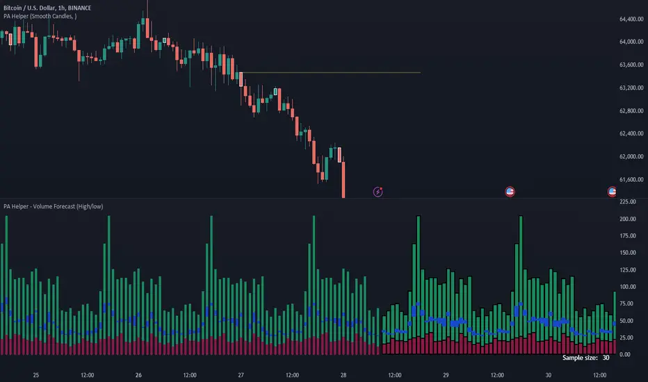 Volume Forecast employs a sophisticated predictive algorithm that leverages historical candle size data to project the potential size of upcoming candles. This algorithmic approach enhances the indicator's accuracy in forecasting market movements.