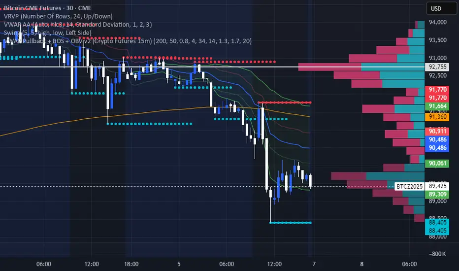 This strategy combines VWAP pullbacks, break-of-structure entries, and OBV confirmation to catch high-quality trend continuation moves on crypto futures. It waits for price to trend above or below the 200 EMA, then pulls back into the VWAP band, signaling a potential reload zone. A trade only triggers when price breaks recent structure in the direction of the trend and OBV shows supportive volume flow. An ATR volatility filter blocks entries during choppy, low-energy periods, and all trades use an ATR stop-loss with fixed reward-to-risk targeting. The result is a cleaner, more disciplined trend-following system designed for 15m–30m BTC/ETH scalping.