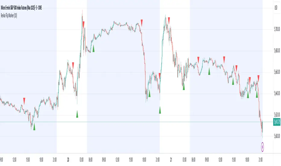 Renko Flip Marker is a visual aid for spotting trend reversals based on custom Renko logic applied directly on standard price charts (candles, bars, etc.).